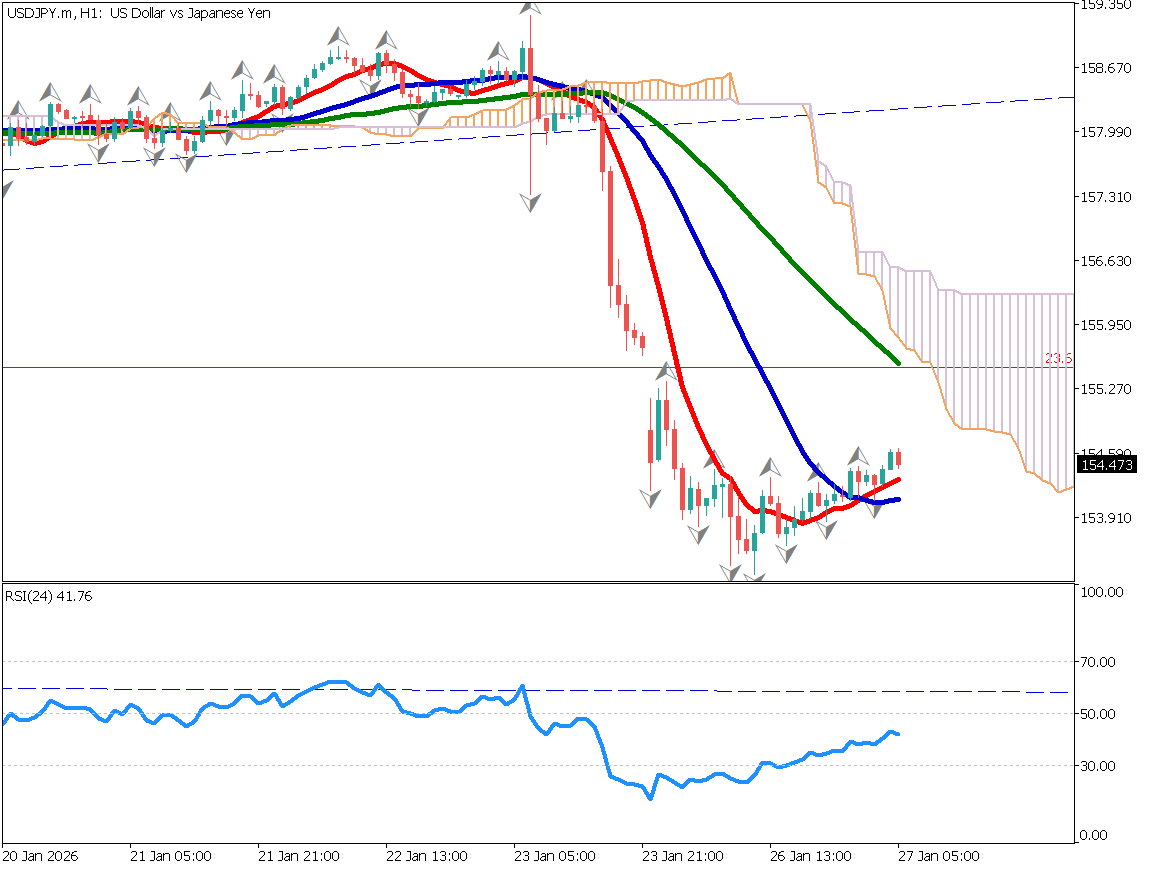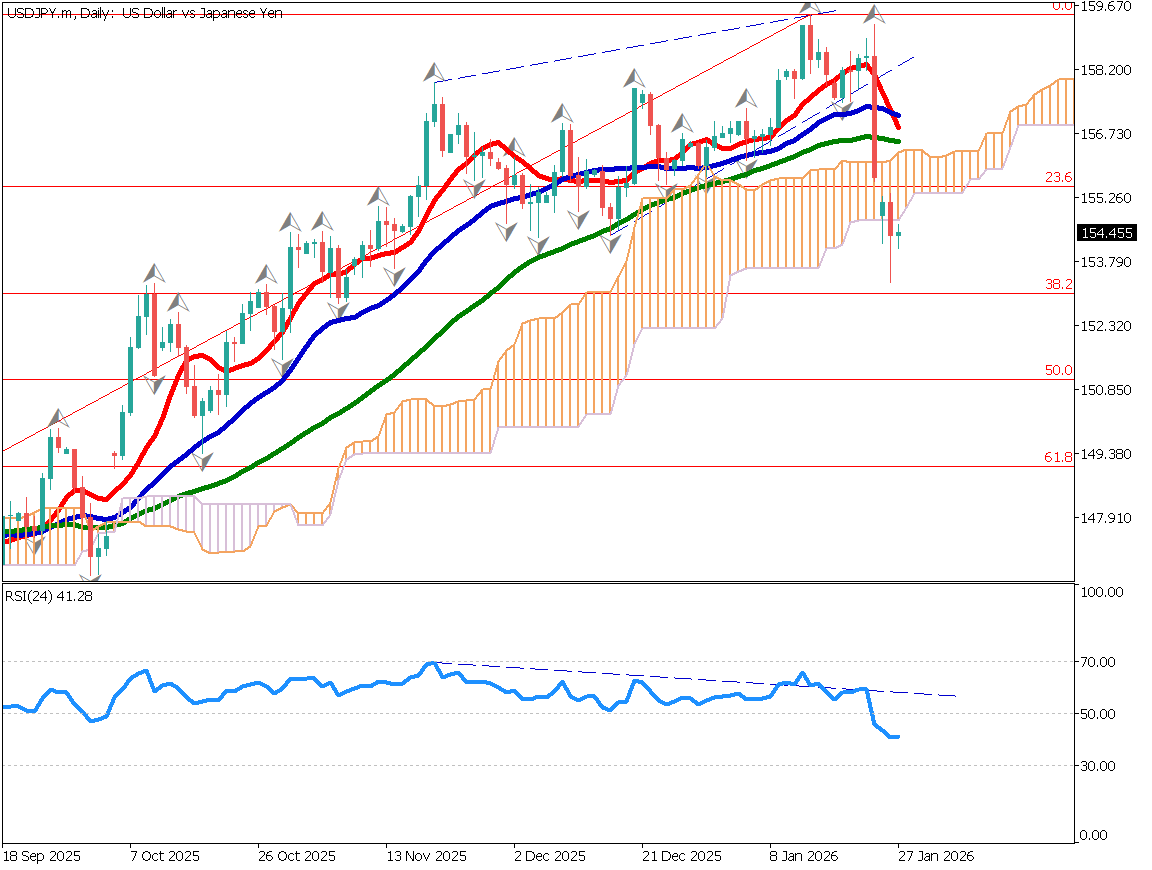 USD/JPY dropped into the 153 range on fears of joint Japan–U.S. intervention, with 153.60 acting as a temporary support level. Ichimoku analysis shows the pair breaking below the cloud, indicating heavy upside resistance. Although the pair did not reach the 38.2% retracement level around 153.00, the presence of lower wicks suggests some dip-buying activity.