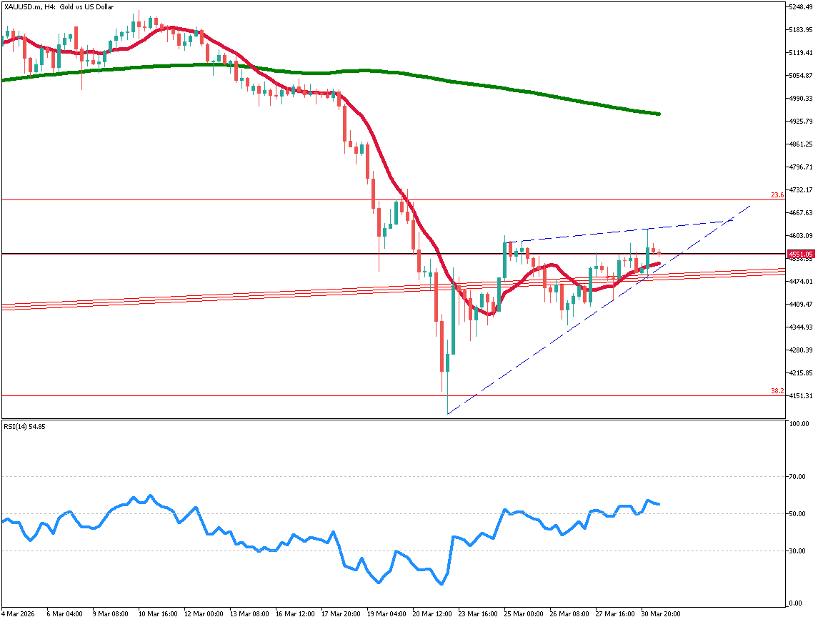 On the 4-hour chart, higher lows are forming, creating a triangle pattern. If this is a consolidation triangle, it suggests a continuation of the trend. The key level to watch is whether price can break above $4,730.