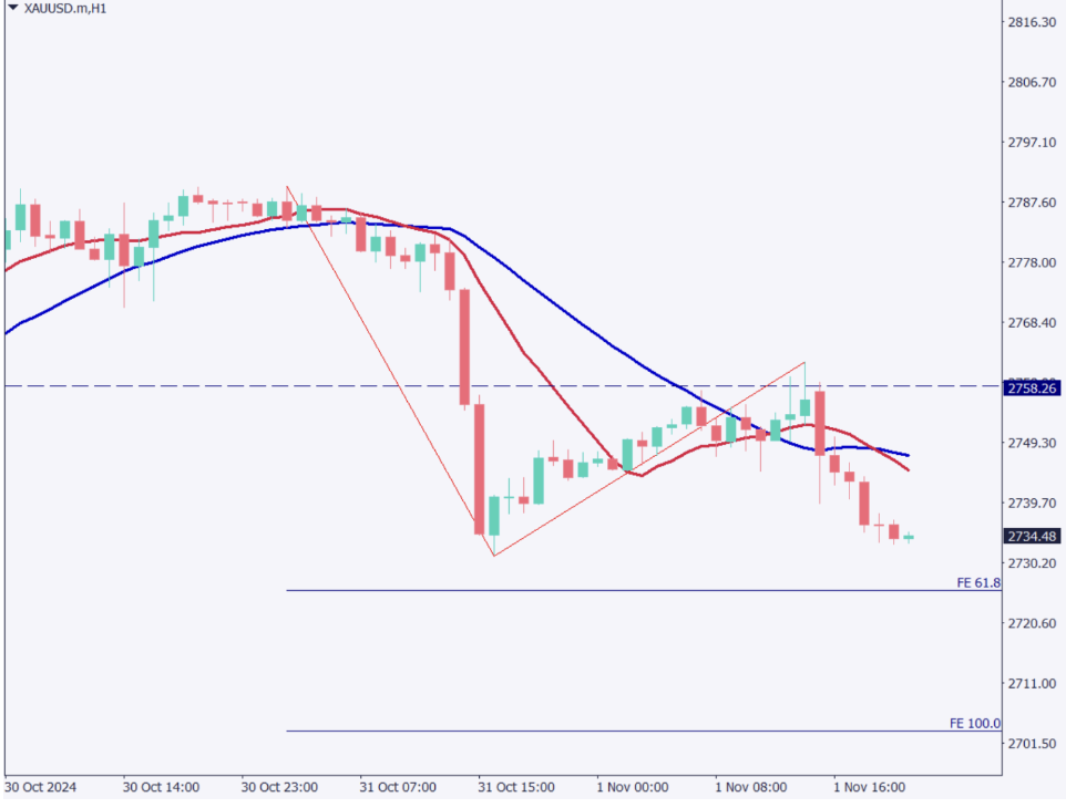 Analyzing the 1-hour chart, the 12-period moving average has crossed below the 24-period moving average, forming a death cross. When plotting Fibonacci Expansion, 2,728 USD aligns with the 61.8% level.