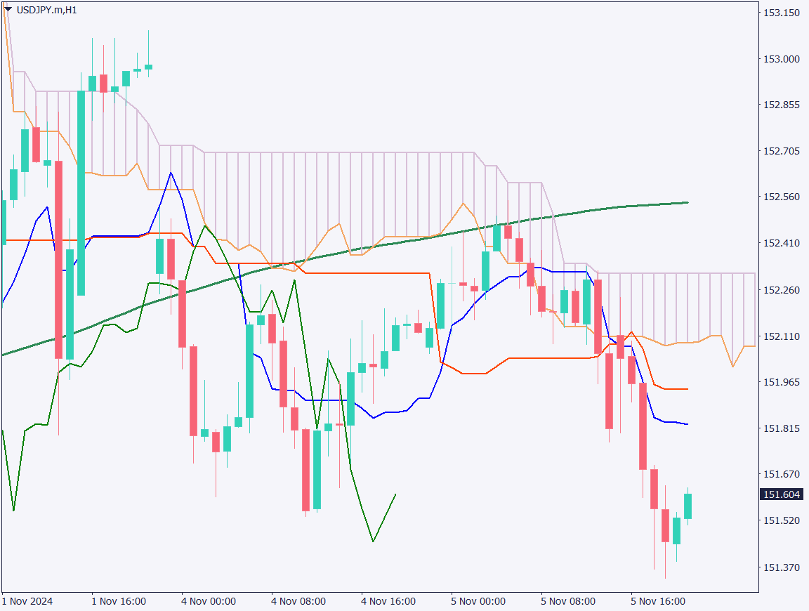 Upon analyzing the 1-hour USDJPY chart, the pair experienced a downturn from the 240 moving average and continued to update its low, now trading around 151.60 JPY. The conversion line has crossed below the base line, and the lagging line has also moved below the candlesticks.