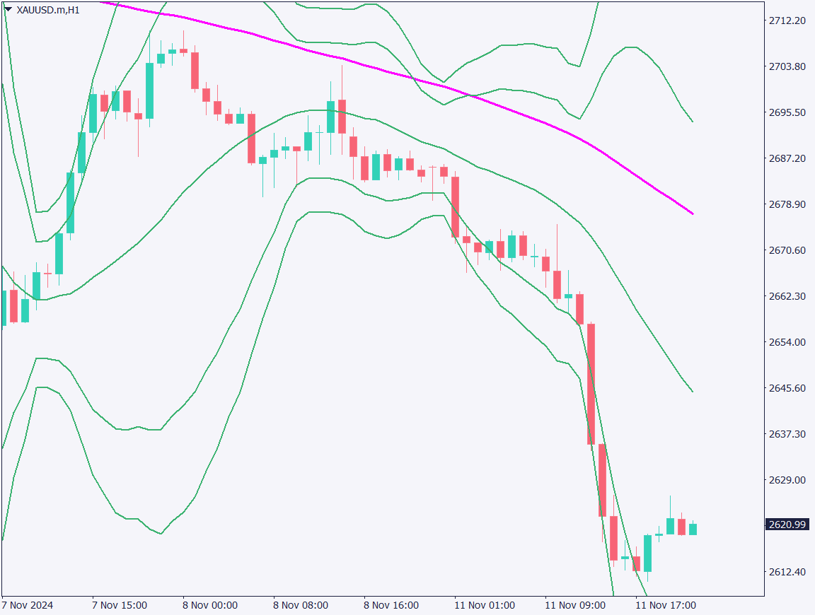Analyzing the hourly chart for gold, the 90-period moving average serves as a pullback point, with gold falling near 2,610 USD. The daily analysis shows potential for a temporary rise to around 2,640 USD due to the Ichimoku cloud and the Bollinger Bands’ -3σ line.
