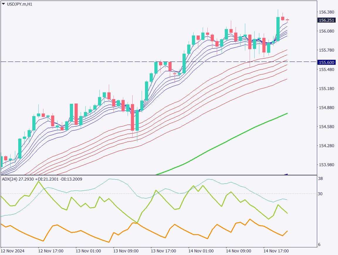 Analyzing the daily chart for USDJPY, the pair has broken through the resistance line at JPY155.60, climbing to JPY156.25. The 200-day moving average is clearly acting as support. Additionally, the gap between the short-term and long-term GMMA indicates the strength of the upward trend.