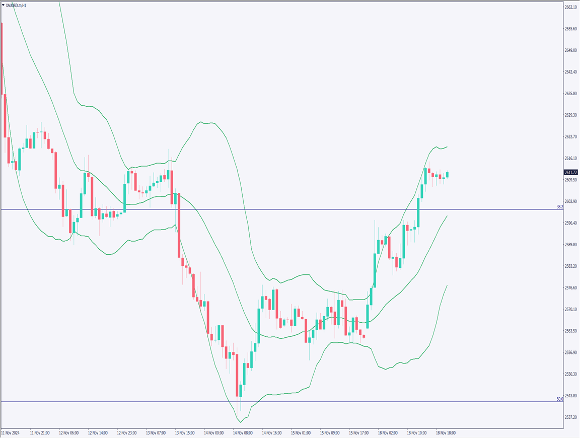 Analyzing the 1-hour chart for gold: Gold saw significant selling around 2,635 USD, followed by a strong rebound. It is climbing along the +2σ line of the Bollinger Bands, suggesting a possible target of 2,675 USD if it surpasses 2,625 USD.