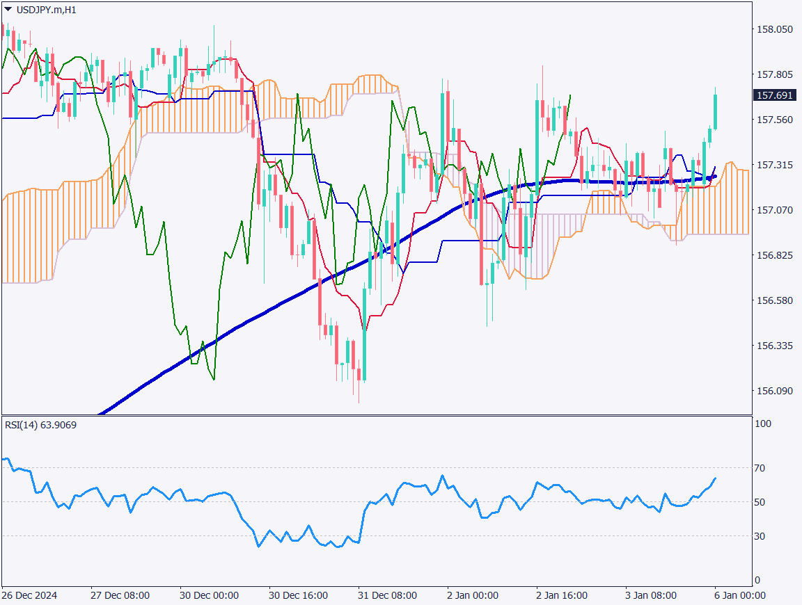 For day trading, the strategy is to buy on dips. A dip into the 157 JPY range is an opportunity for active buying. If the price falls below the daily conversion line at 157 JPY, consider exiting the position.