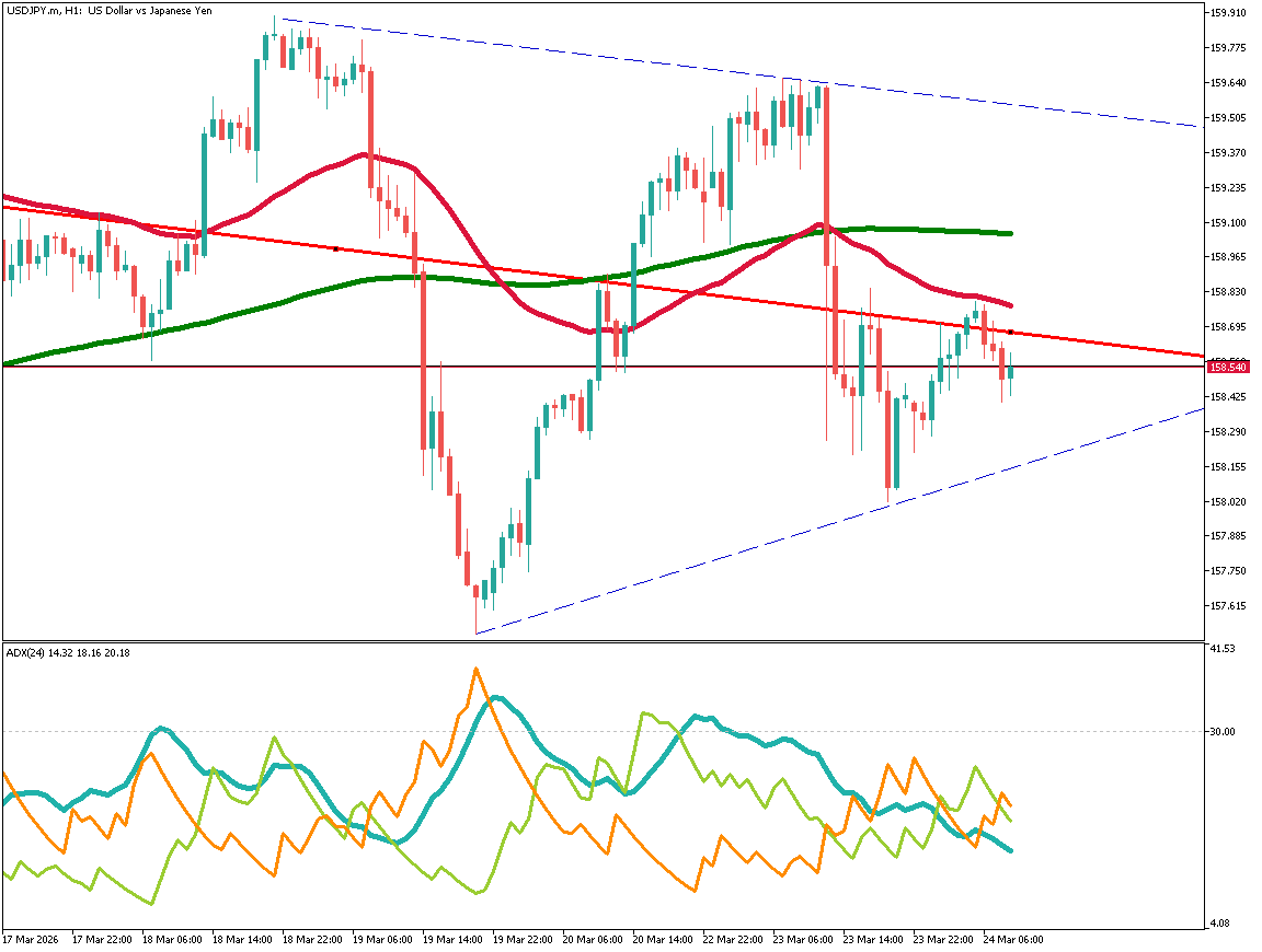 Consolidation Triangle Looking at the 1-hour chart, a symmetrical triangle pattern has emerged. According to the ADX, downward momentum seems to be strengthening slightly. With higher lows and lower highs, we should be alert for a breakout.