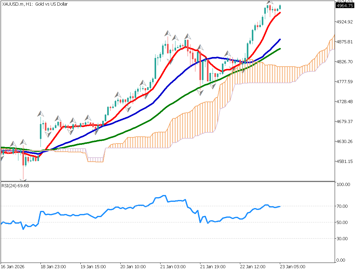 - ゴールドは4964ドルまで上昇し、5000ドルの節目に迫っている。2025年11月に4000ドルを突破して以降、わずか4か月弱で約1000ドル上昇する急騰となった。移動平均線は全期間で上昇基調だが、RSIは78と過熱感が強く、週末要因もあり短期的な調整には注意が必要。5000ドル到達後は利益確定売りが出やすい一方、押し目買い意欲も根強い。