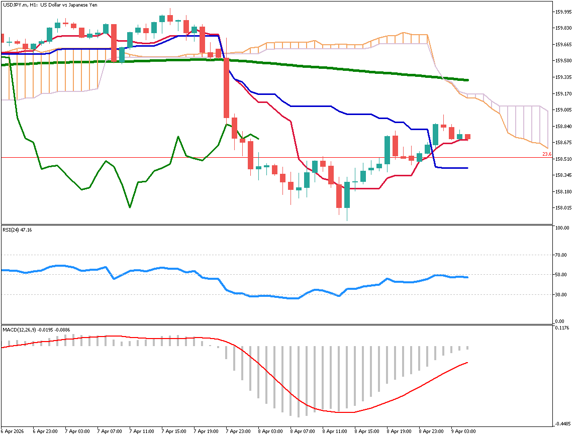 - イラン停戦合意を受けて原油価格が急落し、ドル買いが一服。ドル円は160円手前から158円台半ばまで下落した。テクニカル面ではフィボナッチ23.6%が支持線として機能しているが、割り込めば157.40円付近が次の焦点となる。RSIやMACDは上昇の勢い鈍化を示しており、当面はレンジ相場が続く可能性が高い。今後は日銀の利上げ観測と中東情勢の行方が相場の方向を左右する。