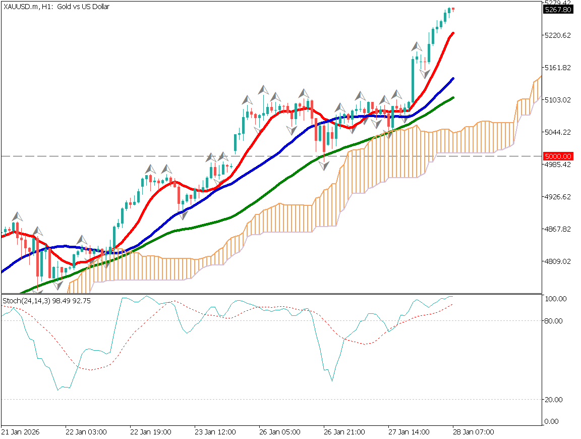 - ゴールドとシルバーはともに最高値を更新し、貴金属市場に大口資金が流入している。ゴールドは5000ドル突破後も上昇が止まらず、FOMO的な買いが続き5200ドルを超えた。米政府閉鎖懸念やドル安、中央銀行の買いも支援材料となっている。一方、オシレーター系指標は過熱感を示しており、5100ドル付近への押し目待ちが意識される。