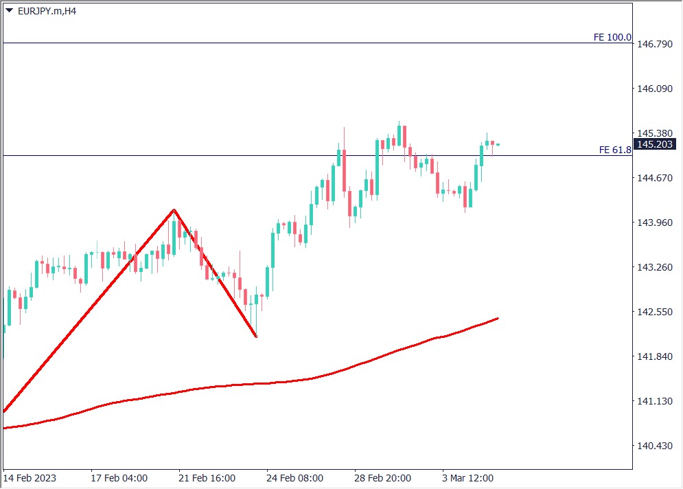 4時間足チャートにフィボナッチ・エクスパンションを描画すると、61.8%に該当する145円が意識されている。最終的には100%に該当する146.70円まで上昇を予想する。押し目買いで臨みたいが、61.8%を割れば、一度ポジションをフラットにして様子見する方針。