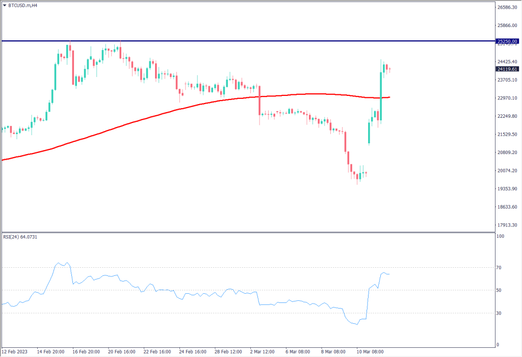 ゴールドが高騰している。また、リスク回避のドル安に伴って円買いが強まっている。米銀行の破綻でファンダメタルが悪化しており、日経平均株価が急落している。仮想通貨のビットコインは急騰。ドル安となっており、2万4,000ドル台を回復している。