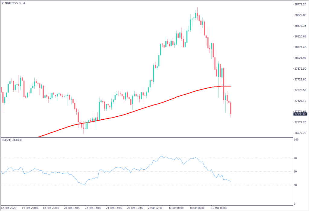 日経平均はファンダメンタルの変化によってトレンドが転換した。米地銀破綻の影響が日本企業にも出るのか、注目されている。一時直近高値を更新し2万8000円台に上昇したものの、ドル安円高の影響によって企業の収支悪化が懸念され下落基調に転じている。4時間足のRSIは34で推移しており、もう一段下落する可能性がある。