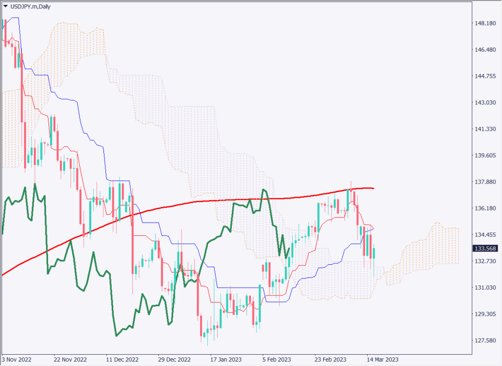 ドル円は金融関連のニュースに敏感に反応しており、右往左往の状態。ボラティリティが高い相場は継続している。日足チャートを分析すると、200日移動平均線で反落しており、チャートの形を見れば下落基調となっている。