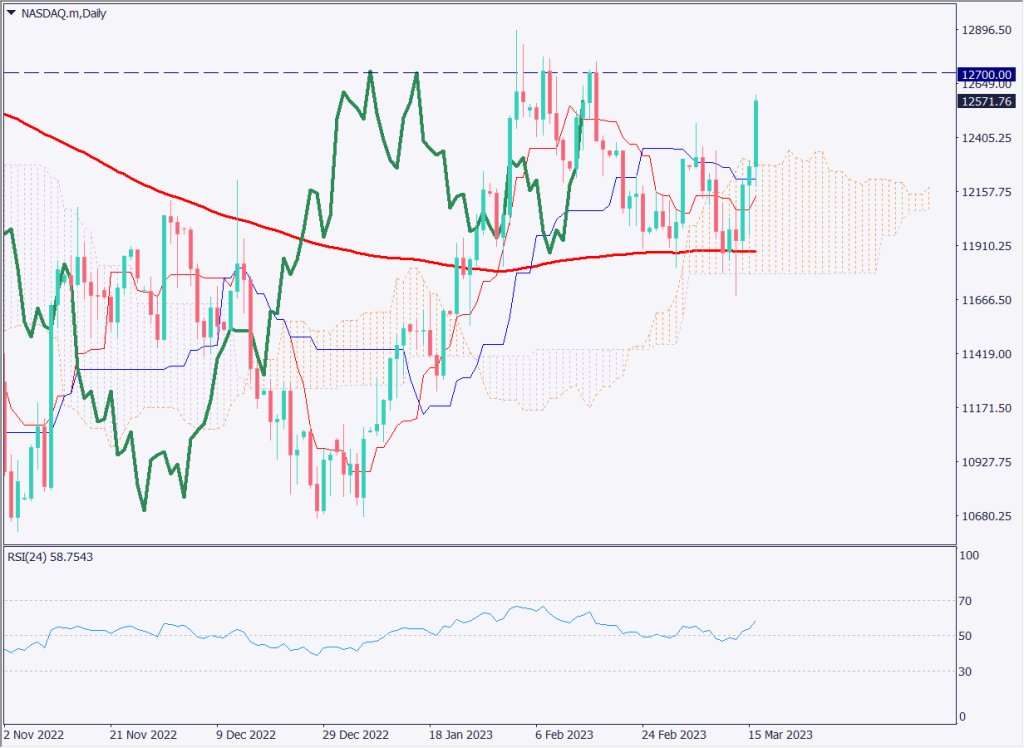 ナスダックの日足チャートを分析してみる。ナスダック100指数は金融業の企業が対象となっている指数。ダウ平均株価やS&P500と同じ動きとはならず、今回の銀行関連のニュースの影響は受けにくい。ナスダックは3日続伸しており、主要抵抗線である12700ドルを目指している。
