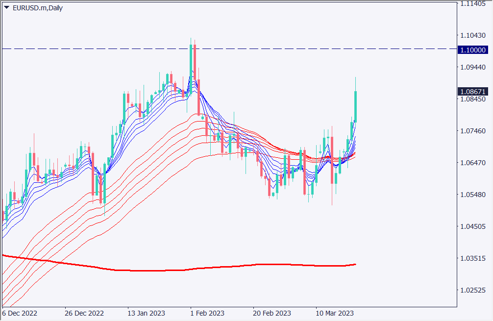 ユーロドルの日足チャートを分析する。1.0884ドルに大きなレジスタンスが控えているが、日足単位ではラウンドナンバーかつ直近高値付近の1.10ドルを目指す展開となっている。