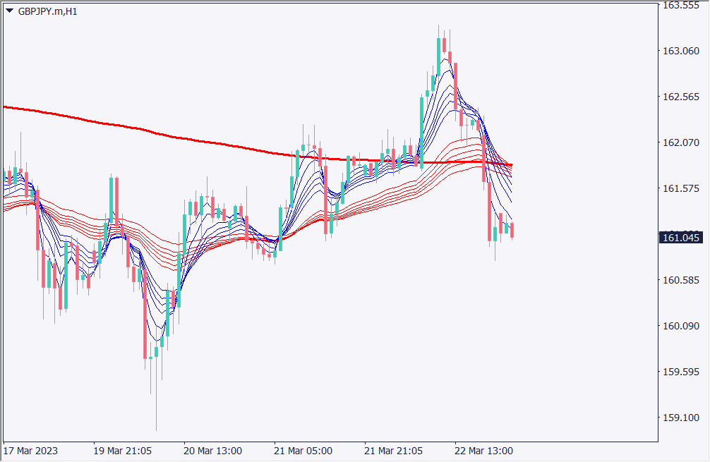 ポンド円の1時間足チャートを分析する。161円台で若干反発しているが、為替相場では円買いが優勢となっている。GMMAを分析すると、短期GMMAが長期GMMAを下抜けしようとしており、160.80を割れると、160.30付近まで下落する可能性がある。