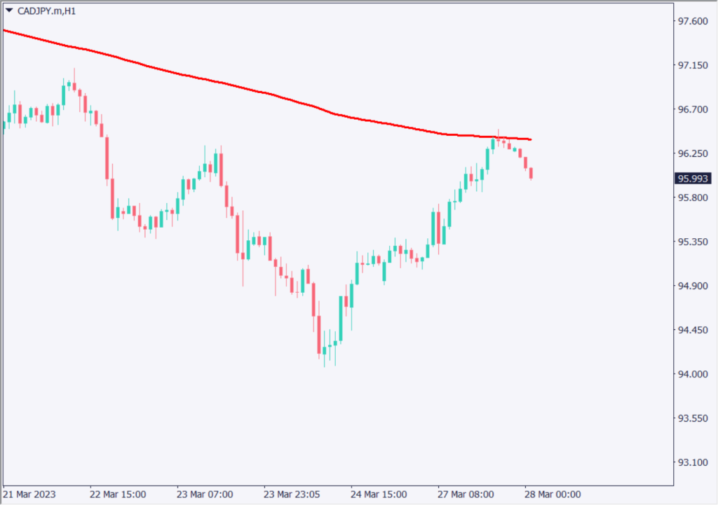 原油の大幅高でカナダドルが全面高になった。一方、リスクオンが意識されたことで日本円が売られやすくなり、カナダドル円は上昇した。1時間足チャートを見ると、240移動平均線(約2週間)で反落していることが確認できる。