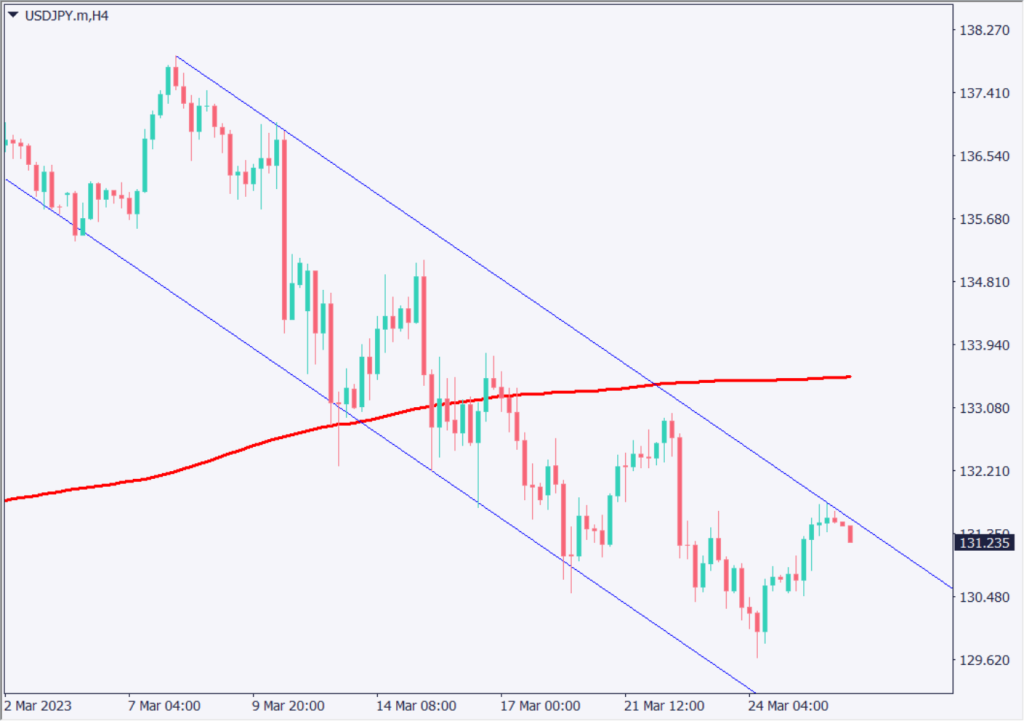 ドル円の4時間足チャートを分析すると、下降チャネルが描画できる。現在はチャネル上限バンドで反落している状態だ。銀行混乱は落ち着くも、米リセッション懸念はあり、ずっと円安が続くというイメージは持ちにくい。再び下落する確率もあるだろう。130.60付近までの下落は考慮に入れたい。