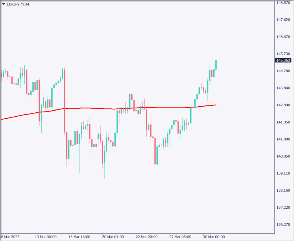 ユーロ円の4時間足チャートを分析する。チャートパターンとして、ダブルボトムの形が出現している。円が売られやすくなっており、ユーロ円は上昇を予想。146.90円付近まで上値を伸ばす展開を予想する。