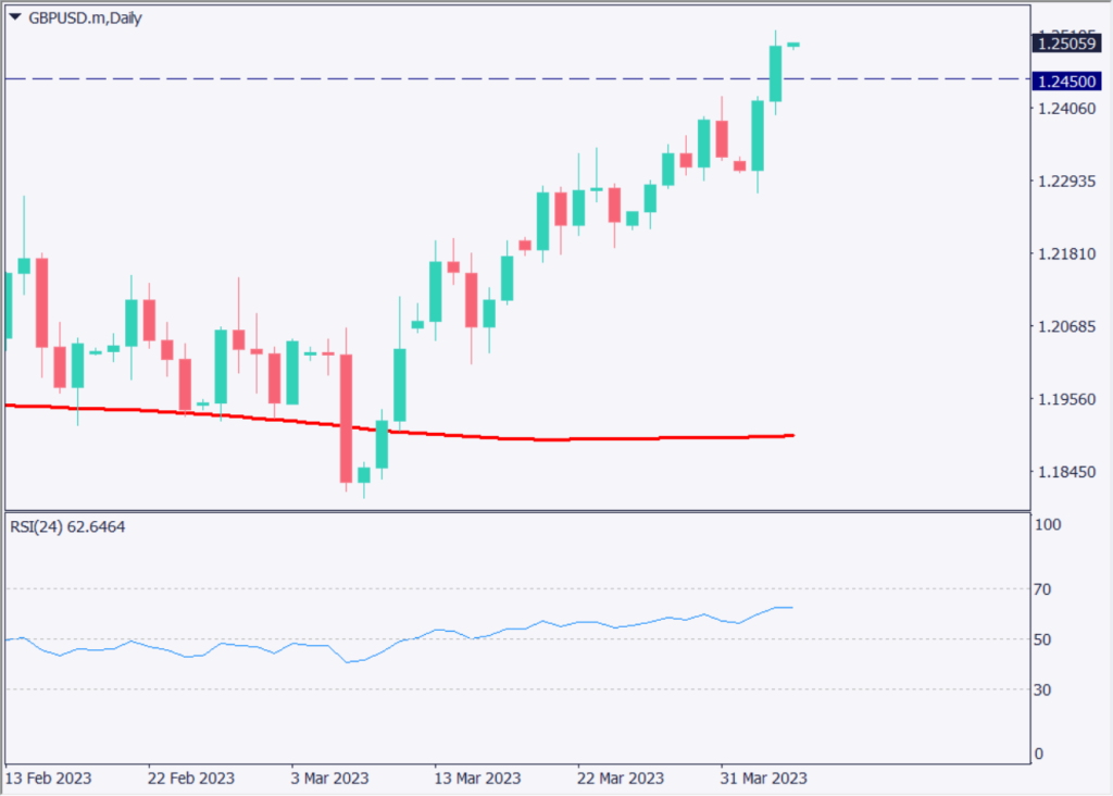 ポンドドルの日足チャートを分析すると、1.245ドルを終値で上抜けた。1.245ドルは過去2回、反落した重要な節目であり、強いドル安によって、一気に上昇した。当局者が追加利上げを示唆しており、ポンドは上昇する可能性が高い。