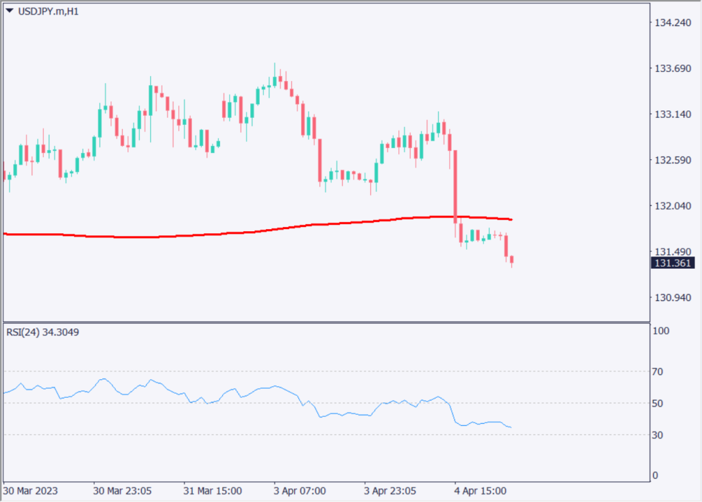ドル円の1時間足で短期的な相場分析をする。移動平均線を下回っており、下落が顕著になっている。131.370円が支持線になっているが、明確に下回ると、130.80近辺まで下落する可能性がある。