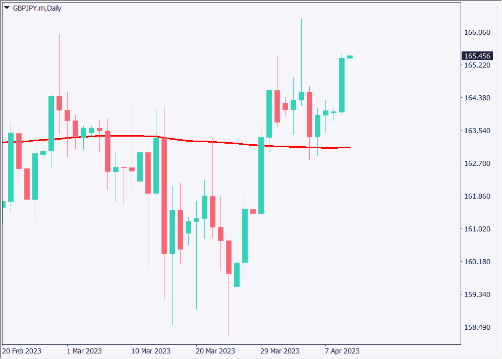 円売り相場となったことでポンド円相場が急上昇した。移動平均線に張り付いてレンジ相場を抜け出せていなかった。165円付近では大きなヒゲが2つ出現しているが、売りポジションのストップを巻き込んで、上昇した形となっている。円売り相場がしばらく継続する可能性が高いため、ポンド円も上昇すると予想できる。