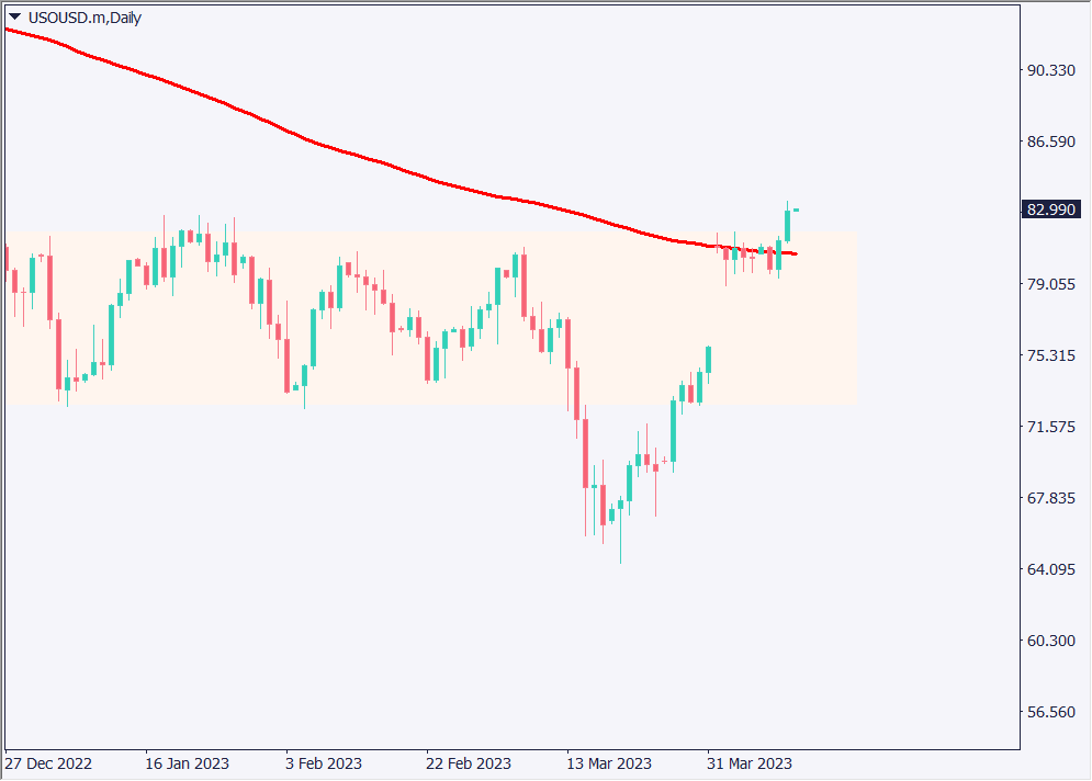 原油は200日移動平均線を上回って推移している。長期で続いていたレンジ相場を抜け出した。ただし、ファンダメンタル的に考えると、景気後退や需要減が意識されることも予想され、慎重に取引したい。テクニカル的にはレンジ上限が支持帯として機能するかを確認したいところだ。