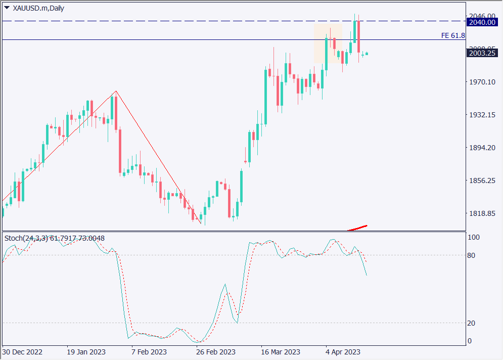 ゴールドは節目となっていた2040ドルで反落した。ユーロドルと同様に高値圏でつつみ足を形成しており、61.8%も割れている。米利上げの発言がかなり影響しているようだ。