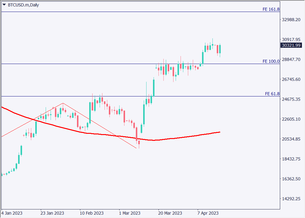 ビットコイン相場であるが、3万ドル台を維持している。フィボナッチエクスパンションを描画すると、20日間の攻防が続いた28600ドルの抵抗帯をブレイクアウトし上昇している。米利上げが確実視されており、売り圧力も強まるが、長期的には上昇する確率が高いと考える。今後、数ヶ月の目標価格は161.8%の34100ドルだが、目先の目標は31800ドルである。