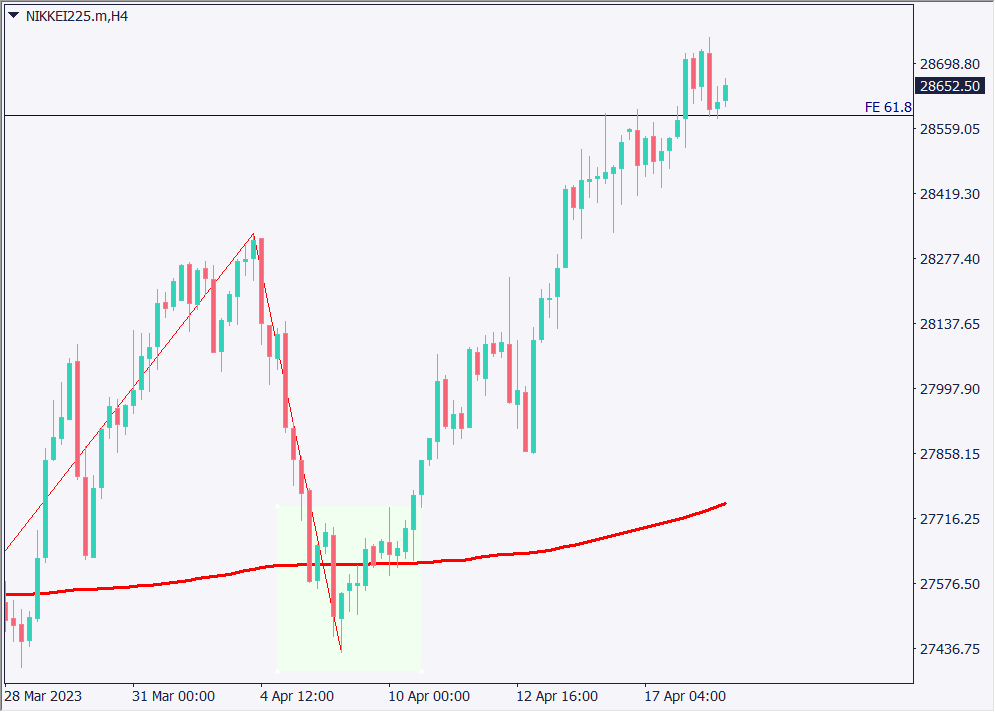 テクニカル的には、移動平均線で反発した後、フィボナッチエクスパンションの61.8%が意識されていることが確認できる。このフィボナッチエクスパンションの100%は2万9300円となる。