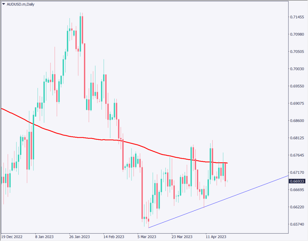 豪ドルは短期では上昇しているものの、240移動平均線を超えられず、弱気ペナントを形成中との見方ができる。この場合、トレンドラインを下方向にブレイクすれば、大きく下落する可能性が高くなる。