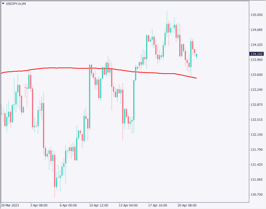 ドル円の4時間足チャートを分析する。240移動平均線が意識されているが、徐々に下向きになっている。現在は移動平均線が支持線として機能しているが、一度割り込むと抵抗帯となる。135円を上回らなければ、134円台のレンジ相場が続くことになる。下値は堅く、上値は重い。