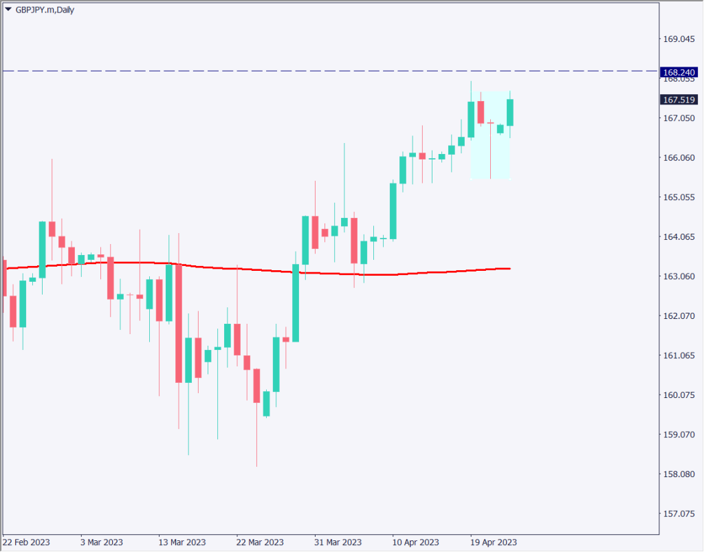 ポンド円の日足チャートを分析する。168.24円に大きな抵抗帯が控えている。最近の動きを見ると、下に大きなヒゲが伸びた十字線のローソク足が確認でき、下値が堅くなっていることが確認できる。
