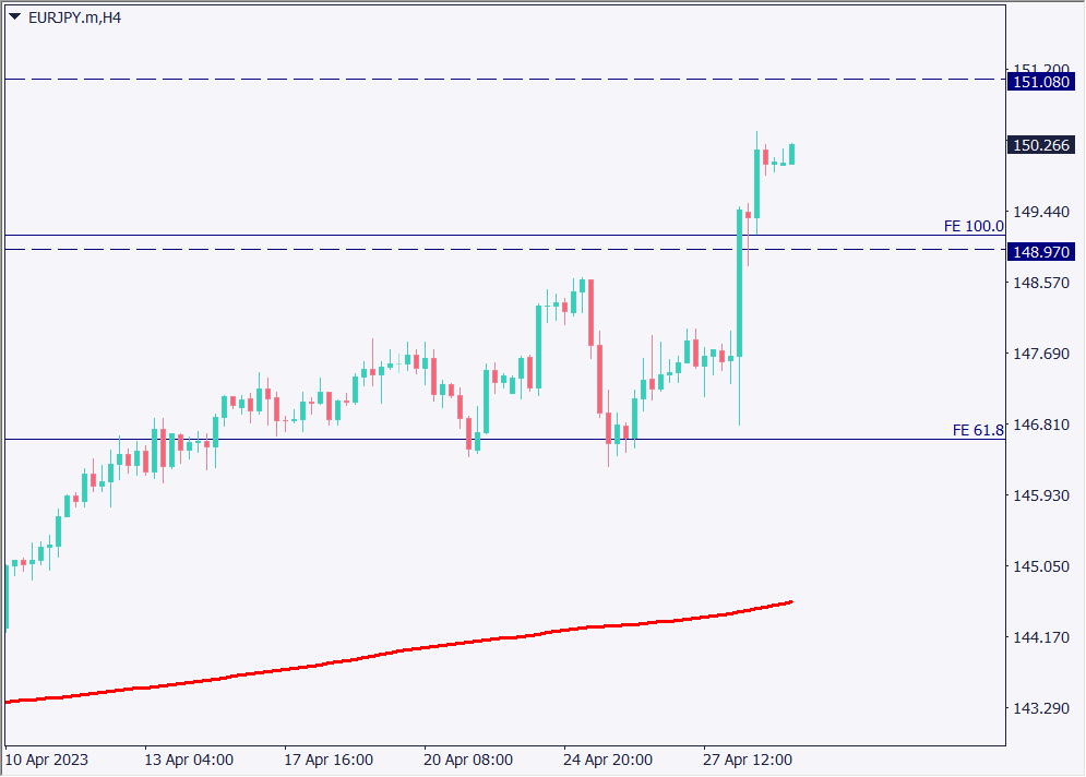 ユーロ円の4時間足チャートを分析する。ユーロ円はフィボナッチエクスパンションを意識した分析をすることが重要だ。61.8%や100%に反応していることが確認できるため、今後は161.8%に該当する153.20円を目指すと考えられる。