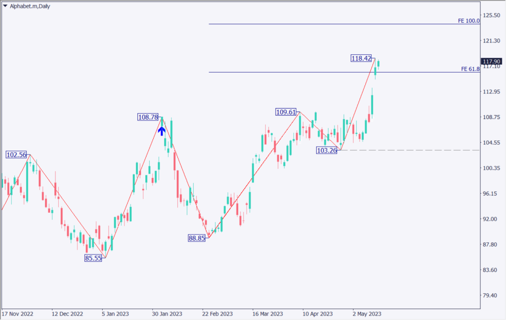 Hotレポートで紹介されたGoogleのチャート分析をする。最近はマイクロソフト系のAIが注目されており、Googleは遅れをとっているのが現状だ。5月6日にGoogleが検索エンジンを大幅刷新する計画を発表し、AIも導入されるとの報道があった。Googleの開発するAIに期待が高まり、アップギャップを形成して上昇している。