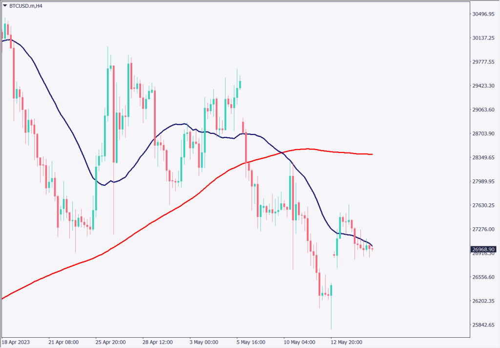 ビットコインの4時間足チャートを分析する。仮想通貨に対する規制が強化される方向となっていることでビットコインは軟調推移となっている。28日移動平均線が抵抗線とし機能しており、ドル高基調になっていることも考慮すると、下落する可能性が高い。