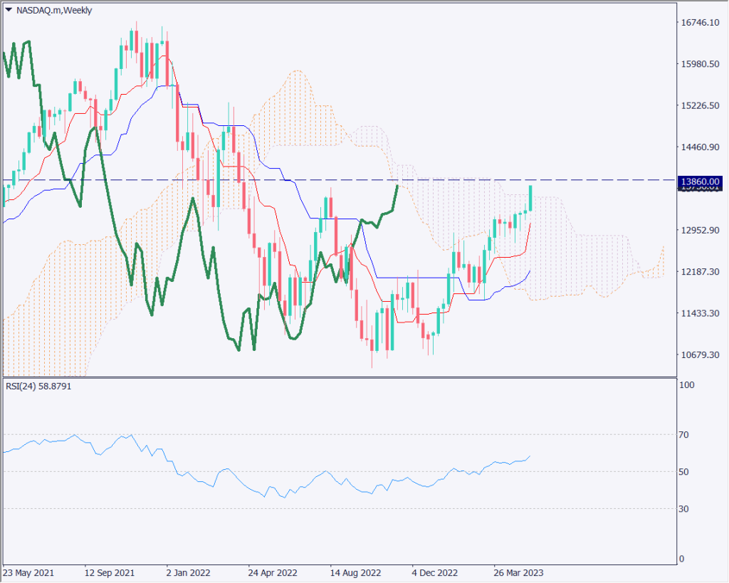 ナスダックはダウ平均株価やS&P500よりも上昇が顕著となっている。ナスダックチャートの週足チャートを分析すると、現在、週足で一目均衡表の雲を上抜けしようとしている。もちろん、遅行線はローソク足を上回り、転換線は基準線を上回っている。三役好転の形状が完成しており、強い上昇シグナルとなる。