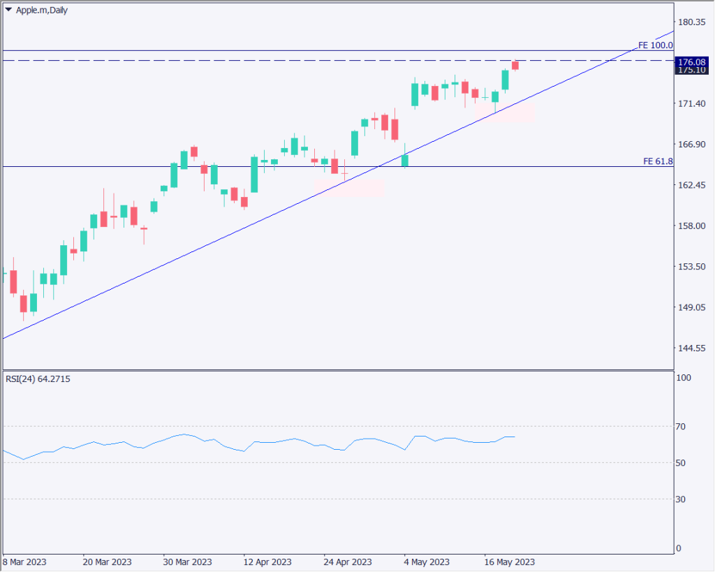 ホットトピックレポートでも紹介されたアップル株価チャートの日足チャートを分析する。アップルは決算も堅調推移しており、電気自動車への参入やAIの強化などを打ち出し、期待感が高まっている。上昇トレンドラインを描画でき、過去3回反発していることから、今後も意識されやすいと想定できる。