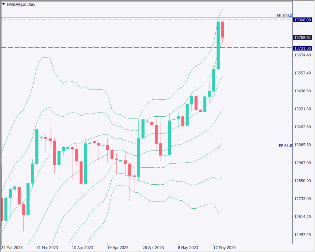 ナスダック100は堅調に上昇している。日足チャートを分析すると、フィボナッチエクスパンションの100%に該当する13910ドル付近で反落。ナスダックは今後も中長期的に上昇する確率が高いが、一度調整の動きをすると予想している。
