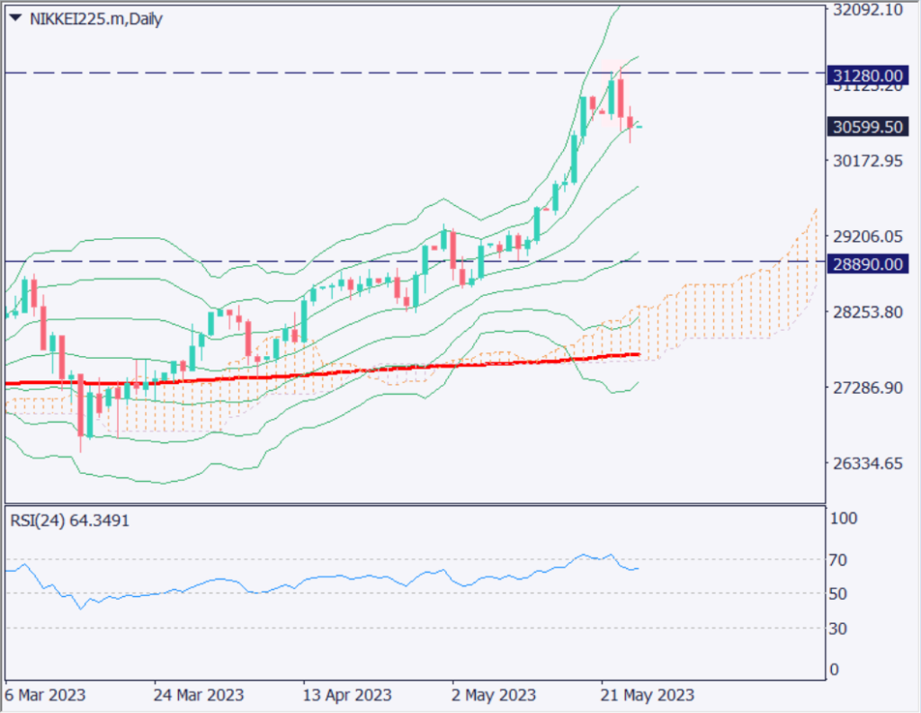 日経平均株価はバブル後最高値を更新した。非常に強い上昇が続いていたが、31280円に強力な抵抗帯があり、利益確定売りの動きが出ている。高値圏で反転のシグナルとして発生するアウトサイドバー(包み足)が発生していることが確認できる。