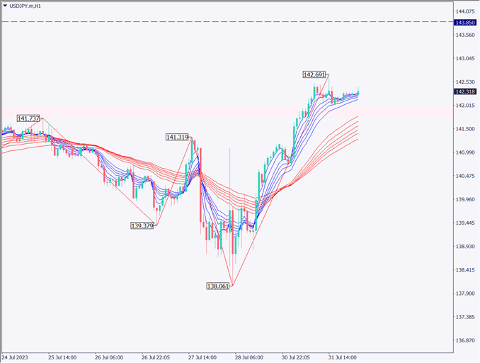 GMMAの長期線(赤線)を見ると、間隔が広がっており、強い上昇トレンドを示唆する形式となっている。今週の上値予想は143.91円付近であり、上昇が見込めそうだ。円を買う理由としては長期金利上昇だが、日銀は臨時の国債買いオペを指示して金利を抑えようとしている。