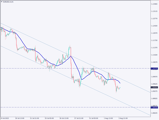 1時間足を分析すると、ユーロドルは緩やかに下落しており、下落チャネルを描画できる。執筆時点ではドル全面高相場となっているため、下落しやすい。そのため、ユーロドルも戻り売り戦略が良さそうだ。下落チャネルの上限ラインで戻り売り、チャネル下限ラインで買い戻しをイメージする。