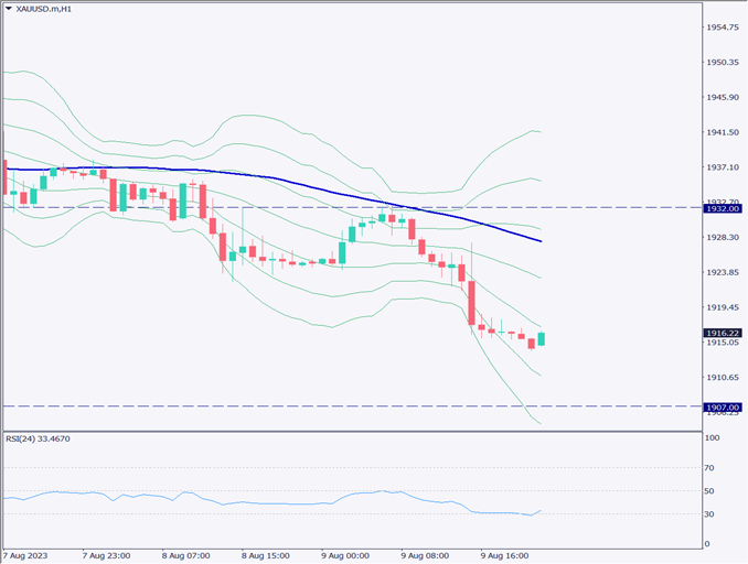 デイトレード方針は戻り売り。RSIを見ると、30を下から上へ上抜けしている。安値付近に推移しているため、一定の反発が予想できる。反発の目安は1920ドルのボリンジャーバンド中央線付近。