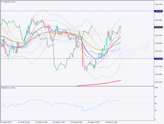 現在の価格は146円を既に突破しており、中長期的には150円を目指しての上昇が期待される。しかしながら、パウエル議長が講演で利下げの時期に明確に言及するような場合、ドル売りの動きが強まる可能性も考えられる。