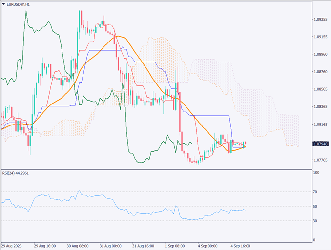 ユーロドル相場の1時間足チャートを分析する。24移動平均線、すなわち過去1日の移動平均線を上回って推移している。上値には雲が控えているが、基準線・転換線をローソク足が上回り、遅行線もローソク足を上抜けしている。短期的には上方向に進む可能性が高まっている。