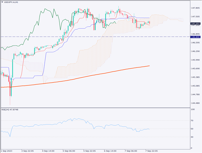 特に、一目均衡表の雲下限147.09円を下回る動きが見られた場合、短期的な売り圧力が強まる可能性がある。トレード方針としては、短期売りを考え、ストップは一目均衡表の雲上限に設定し、決済目標は146.80円とする。