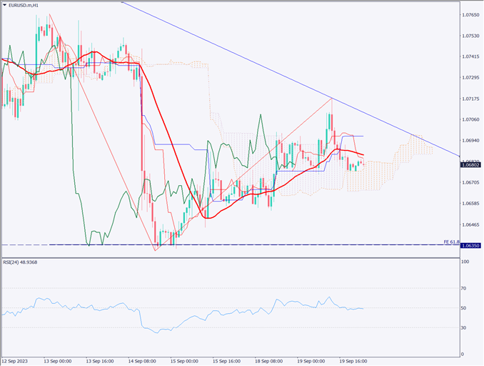 ユーロドル相場の1時間足チャートを分析する。RSIは50付近でのもみ合いを継続。市場はFOMCの結果と米の金利見通しを待機中。24移動平均線を下回る展開で、一目均衡表の雲を下抜ければ、1.0635ドルまでの下落が視野に入る。