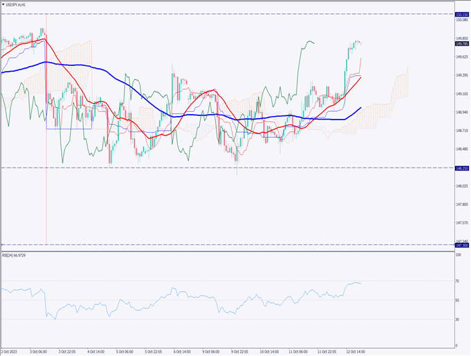 ドル円相場の1時間足チャートを分析する。149.50円を突破し、150円に3度目のアプローチを見せる。RSIは66近辺で、150円を超える動きに注目。追加利上げ観測が高まり、ファンダメンタルは上昇基調も、高金利の副作用を危惧する声も。エントリーには価格帯が高く、押し目を待ちたい状況。