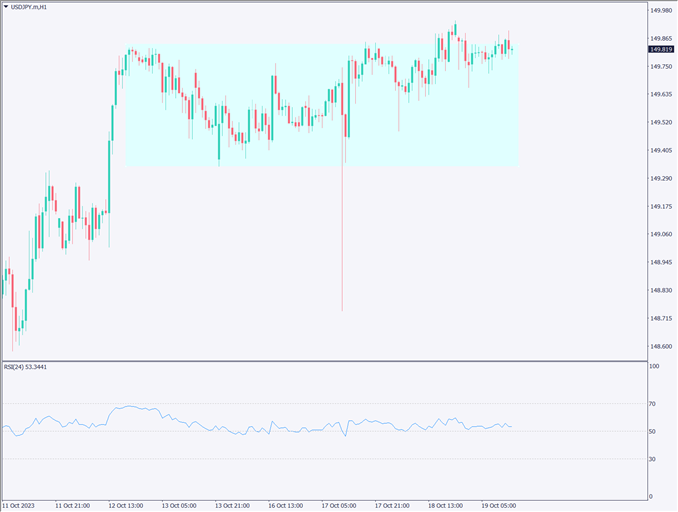 ドル円相場の1時間足チャートを分析する。今週は非常に狭いレンジ、約30Pipsで推移。パウエルFRB議長の発言や米金利政策が焦点。150円付近での推移が続き、RSIも50付近で方向感が乏しい。