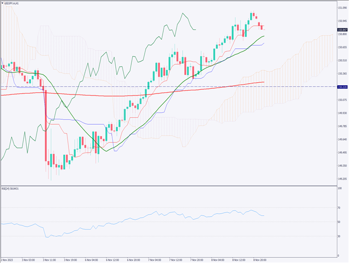 ドル円の日足チャートを分析する。24日移動平均線で反発し、3日続伸している。日銀総裁が物価と賃金の好循環が起きつつあると発言したが、現在は、実施されている金融緩和政策が妥当という見方を示し、円安ドル高の流れが強まった。ドル円は一時151円台に上昇し、終値も150.80円付近となっている。