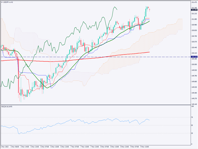 ドル円相場の1時間足チャートを分析する。パウエル議長の発言後、151円半ばを超える上昇が見られ、下値のサポートは強化されつつある。為替介入の懸念もあるものの、ファンダメンタルズは引き続き上昇を支持している。チャート上では、一目均衡表の線と24時間移動平均線が上向きのトレンドを示し、240時間移動平均線も上昇の勢いを増している。